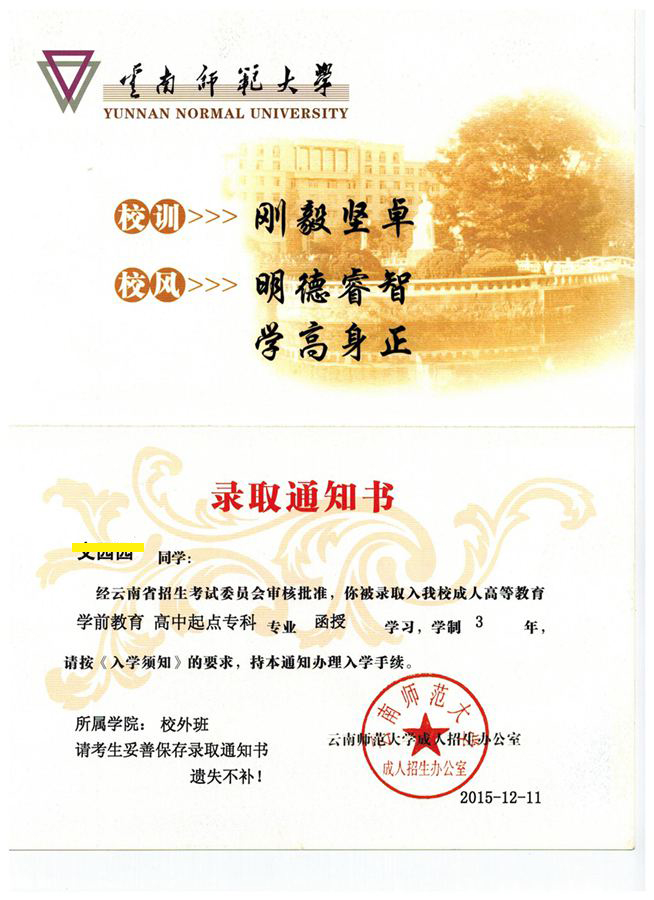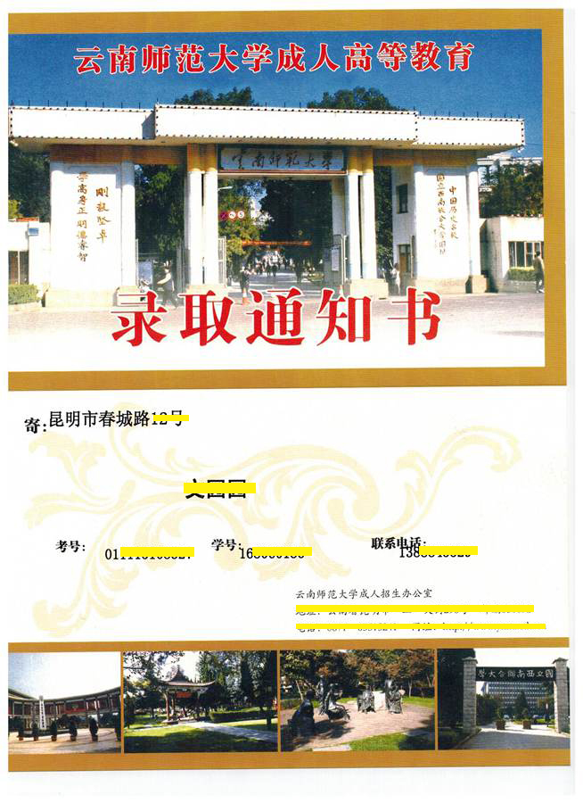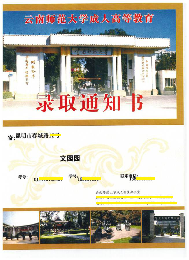 【耀恒教育】2015年云南省成人高考錄取(云南師范大學錄取通知書)領取通知: