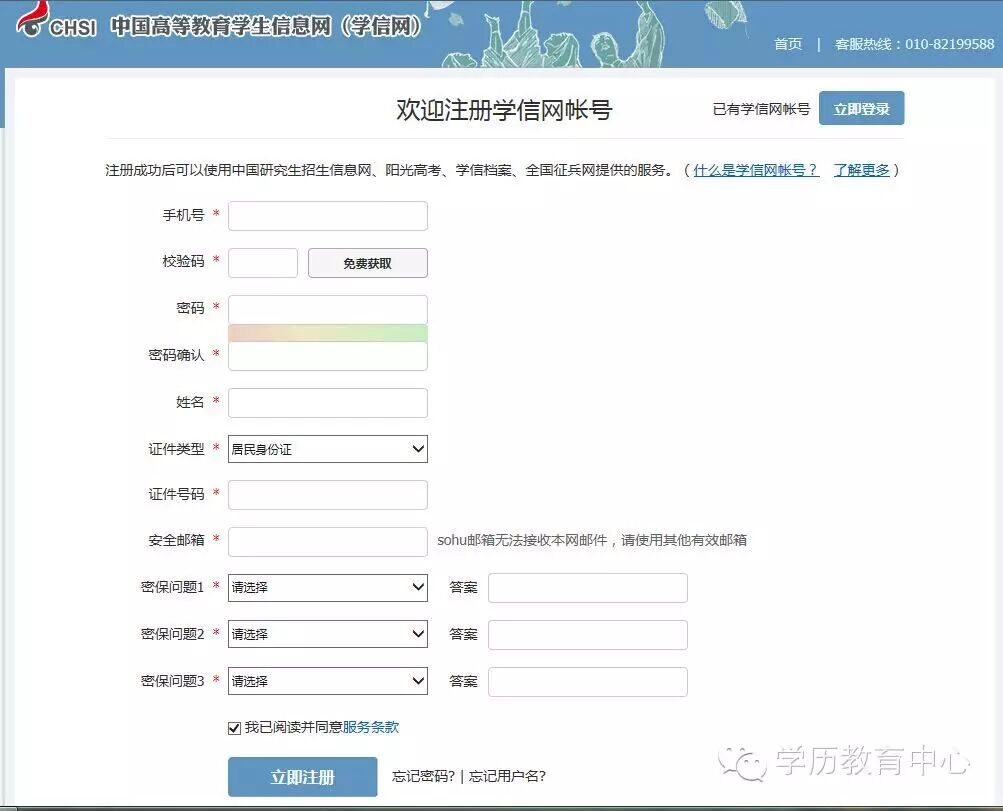 第三步:點擊注冊,注冊學信網帳號,填寫完畢點擊“立即注冊”