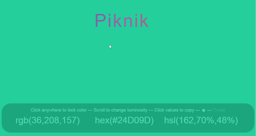 其他類似的工具還有Piknik (color.aurlien.net),Piknik是地球上最基本的色彩工具之一,只需輕輕移動鼠標去改變顏色,滾動一下改變亮度,然后點擊復制數值到粘貼板上,大功告成矣。
