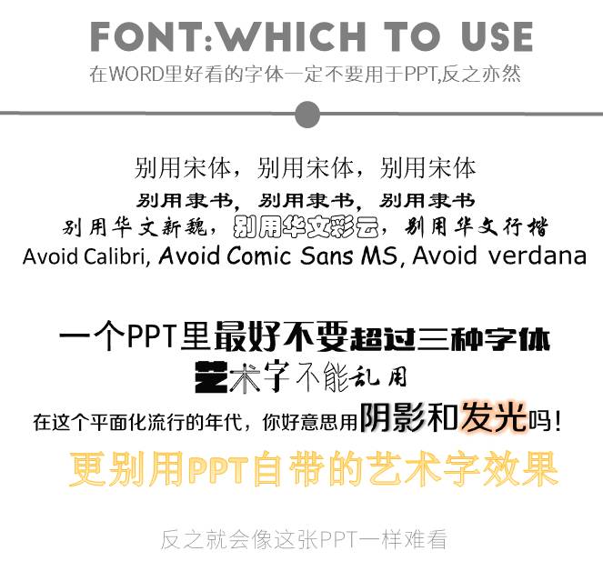 在Word里好看的字體不要用于PPT,反之亦然。一個PPT里最好不要出現三種字體,以及,不要藝術字。